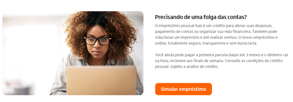 Ademais, este empréstimo é destinado a quem já tem uma conta no Itaú. Se você ainda não possui, será preciso abrir uma conta no banco, o que pode ser feito facilmente online.