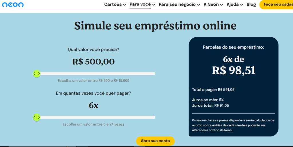 Além disso, a Neon não concede empréstimos a pessoas com restrições de crédito, como SPC ou Serasa.